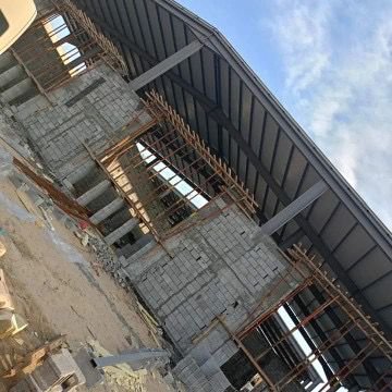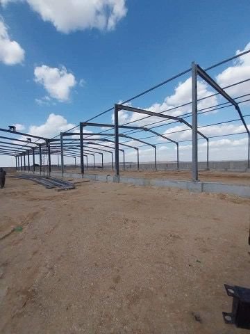 يتم تركيب الأعمدة والجسور المعدنية التي تشكل الهيكل الأساسي للهنجر أو المستودع.